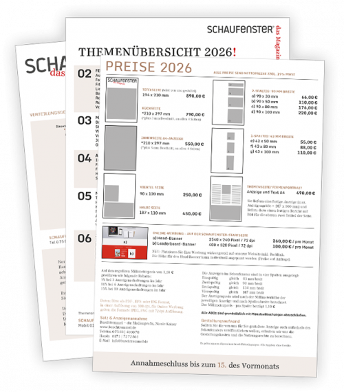 Sie möchten einen Artikel oder eine Anzeige im Schaufenster schalten? Gerne nehmen wir Ihre Daten bis zum 15. des Vormonats per E-Mail, Fax oder persönlich entgegen.